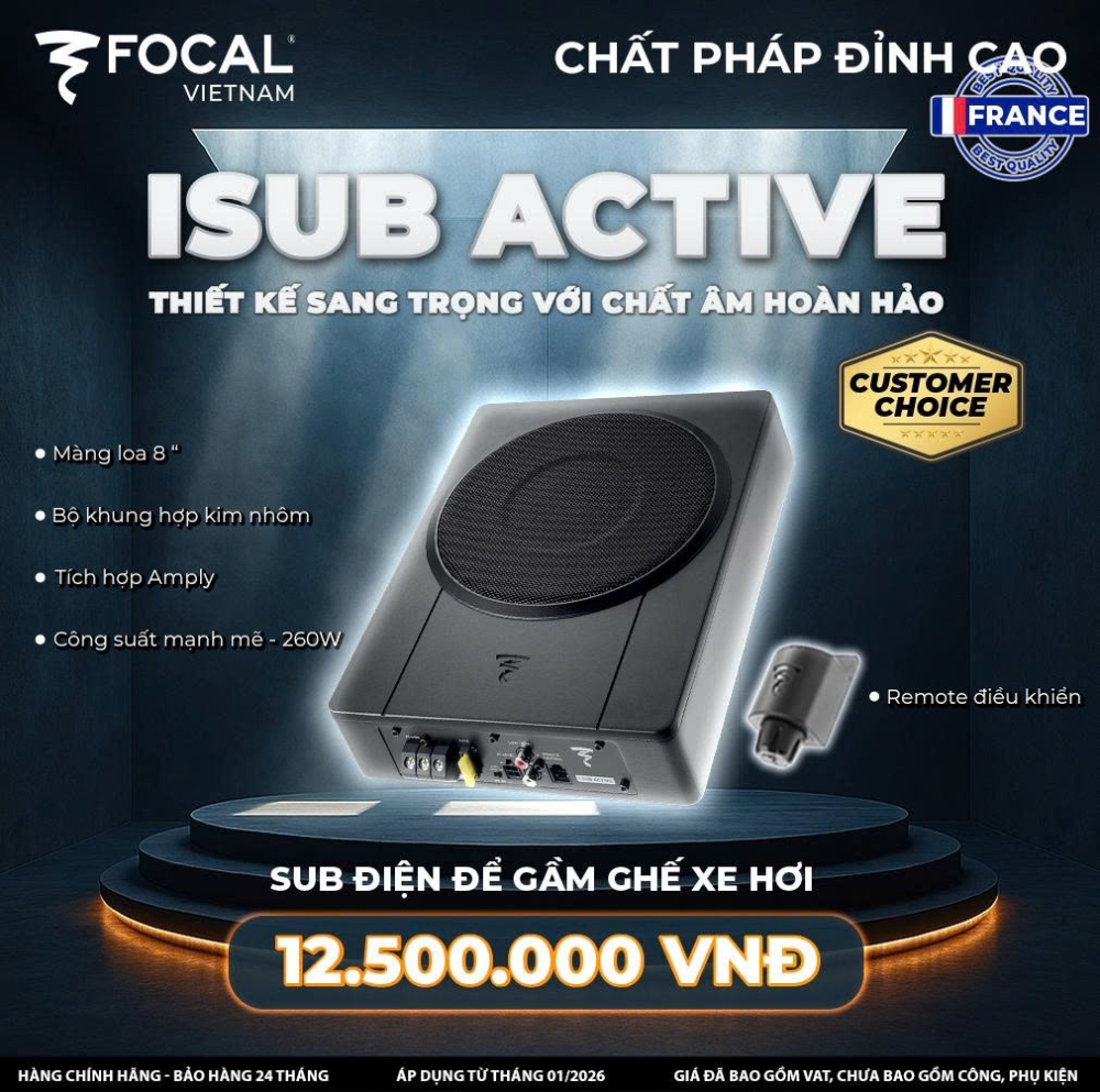 Sub điện Focal Isub Active là một trong những dòng sub cao cấp nhất thị trường hiện nay với công suất cao và khả năng tái tạo âm trầm cực tốt , với thiết kế nhỏ gọn có thể lắp đặt dưới gầm ghế mà không ảnh hưởng tới không gian. Được sử dụng củ loa 8 inch dạng phẳng (Flat Speaker) cho khả năng tái tạo bass chắc, gọn, đánh nhanh, không ù rền. Nhờ ampli tích hợp sẵn, sub hoạt động ổn định, mang lại nền trầm dày dặn, giúp tổng thể âm thanh trở nên đầy đặn, giàu năng lượng và sống động hơn rõ rệt, đặc biệt khi nghe EDM, Pop, Bolero hay nhạc Acoustic.